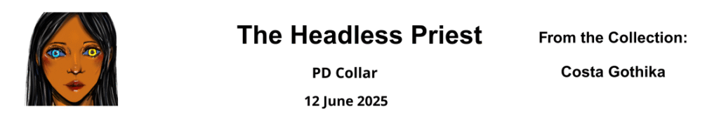 But when a cab stopped for him and asked where to and smiled and was friendly, Fuji Yamanaka was pretty certain that he yet walked the land of the living.  There were rumors of a headless priest that his team had laughed about as they poked chopsticks into their faces back at their Guarco headquarters.  Yet, clearly, the headless priest schtick must have impressed him subconsciously for why else would he have invoked through his personal madness a completed cathedral replete with just such a deconstructed priest, body modifications and all? What could possibly be in it for him to imagine and dream such things?
