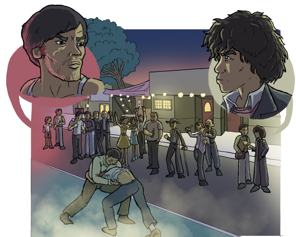 Elmer negó con la cabeza, se restregó con un dedo para ver la sangre de su mejilla y se giró para entrecerrar los ojos y mandar al carajo a su ángel del hombro izquierdo para abrirle campo al diablo pegando brincos y saltos en el derecho. La multitud rugió. El extranjero bailaba, descuidado bajo la cerveza, y Elmer acechaba usando sus largos brazos mientras el extranjero derrochaba energía en golpes salvajes que no conectaban. Lo siguiente, Elmer tenía al chico dominado con una llave de cabeza; levantó sus pies y aterrizó sobre el pecho golpeándolo repetidamente hasta que le sacó el aire, y por fin se levantó apartándose, sacudiendo su ropa.