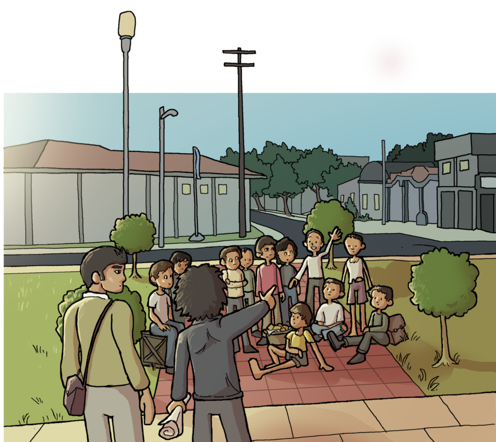 Los Praderos se dispersaron y el Chapo se sentó en una banca de concreto a vigilar su territorio mientras Emi llevaba a los hambrientos a buscar comida.