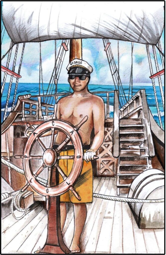 “A gift for you,” the Lieutenant emerged from the shadows behind the bare-chested gringo to smile at George and declaim.